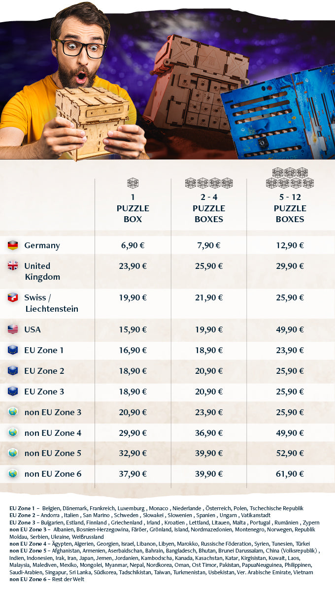 Wir berechnen die Versandkosten je nachdem wieviel Puzzle Boxen bestellt werden.